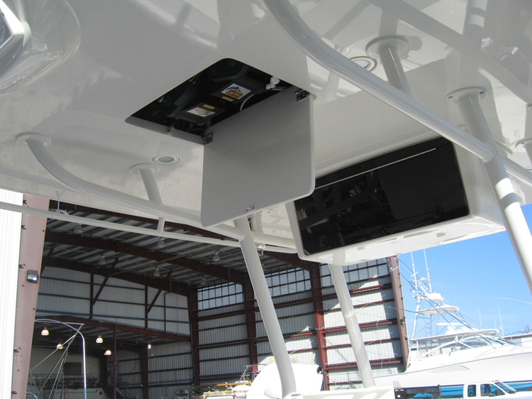 This center console received a brand new T-top powercoated frame with a fully customized fiberglass hardtop. The hardtop received taco top mount rigger, nav lights, radar pod w/ teaser reels, rod holders, handrails and used the existing electronics box.