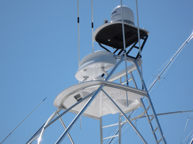 PBT was back in North Carolina in April to install a custom 9' gap tower package on the first 69' Spencer "Da Bait" for avid Billfish angle Jeff Cohen and Capt. Curt Lind. The boat spends most of the year at Los Suenos and the remaining time in St. Thomas, So Curt spends much of his day in the tower. To accommodate all of his needs up top, we installed a dedicated pair of electric teaser reels under the buggy top, offset the wheel & controls to the STBD side. This allowed us to provide him with a large recessed electronics box to hold various units including 12" display, plus CAT engine displays. To eliminate glare from the sun, PBT painted the entire buggy top frame and fiberglass underside Satin Black. The final custom piece was a wrapped belly band cushion for extra padded comfort. With the various size tackle this customer needs for fishing throughout the world, they required an additional rod storage, which PBT molded into the hardtop to hold (10) rods & reels plus gaffs. Also designed into the hardtop was a recessed electronics box, recess opening to hold (4) electric teaser reels and a Satin painted underside. Rupp's 48'- 4 spreader hydraulic outriggers were installed to provide the ultimate spread, along with (6) rod holders on the tower aft legs. LED spreader lights and tri colored accent lights provided bright lighting throughout the tower.