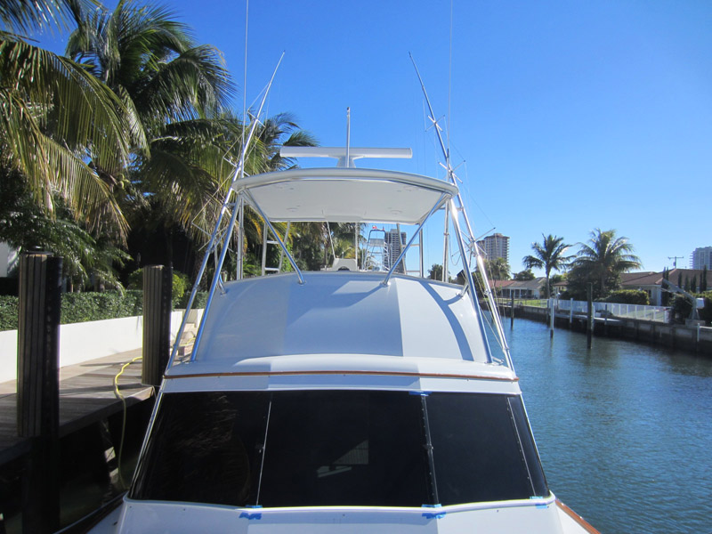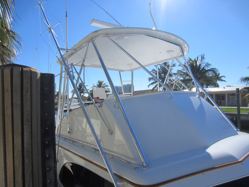 This hardtop and frame refit was a very simple job. We replaced the hardtop and frame, added a new fiberglass hardtop complete with radar pod, outrigger locks, recessed lighting, under mount speakers and LED lighting.